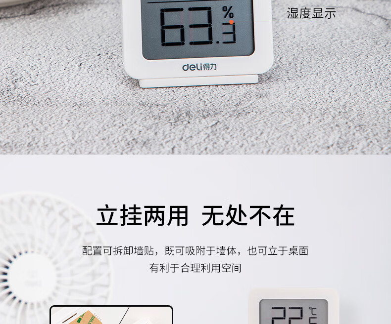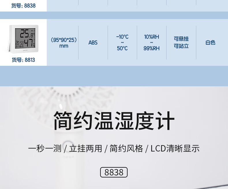 得力(deli)LCD電子室內(nèi)溫濕度計 一秒一測 吸附站立兩用式 白色8838