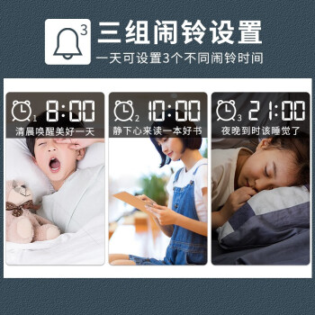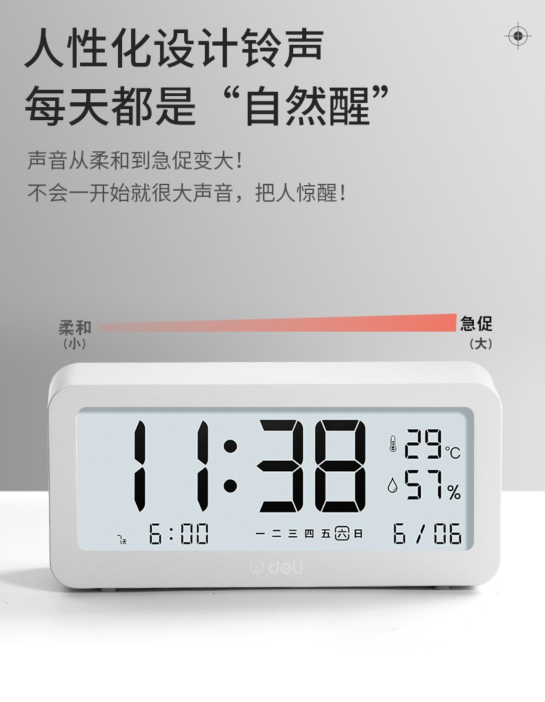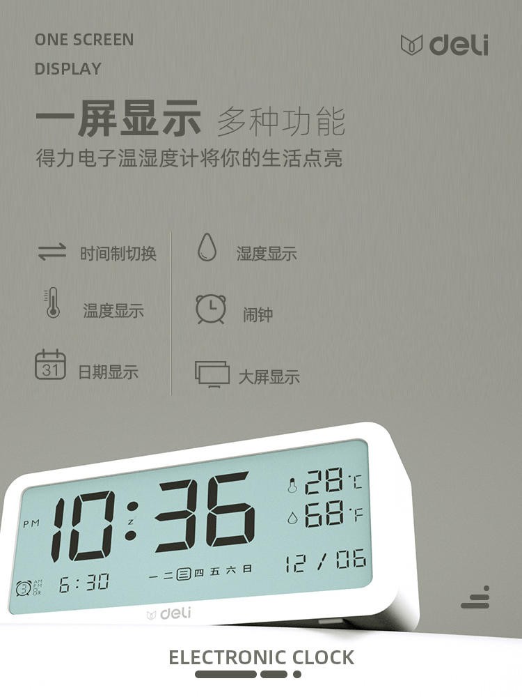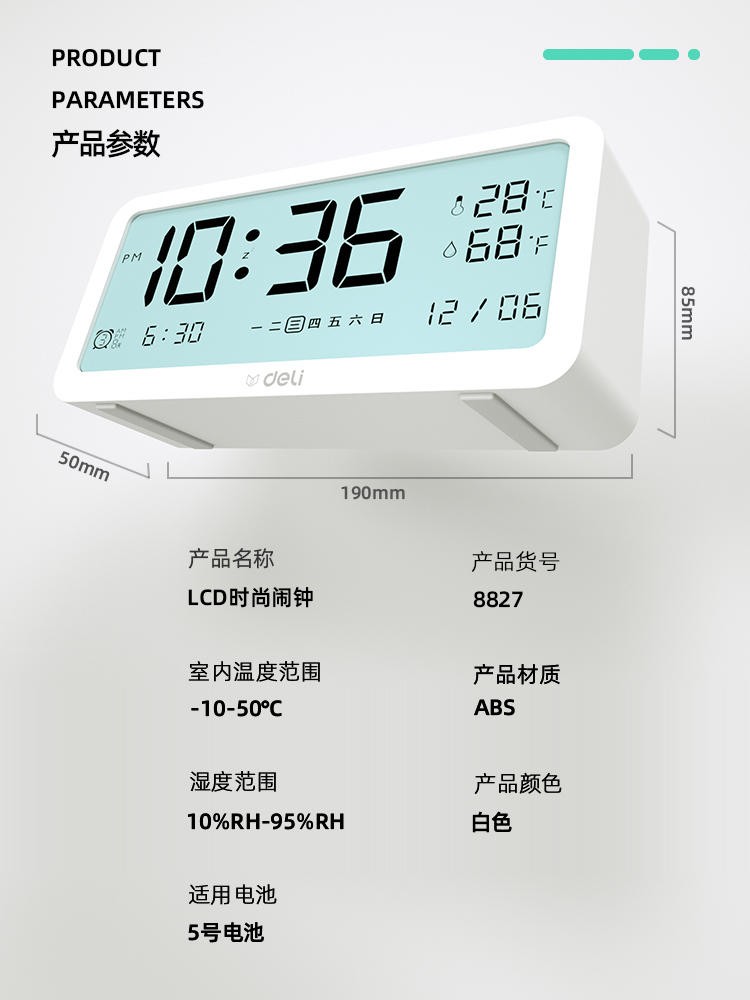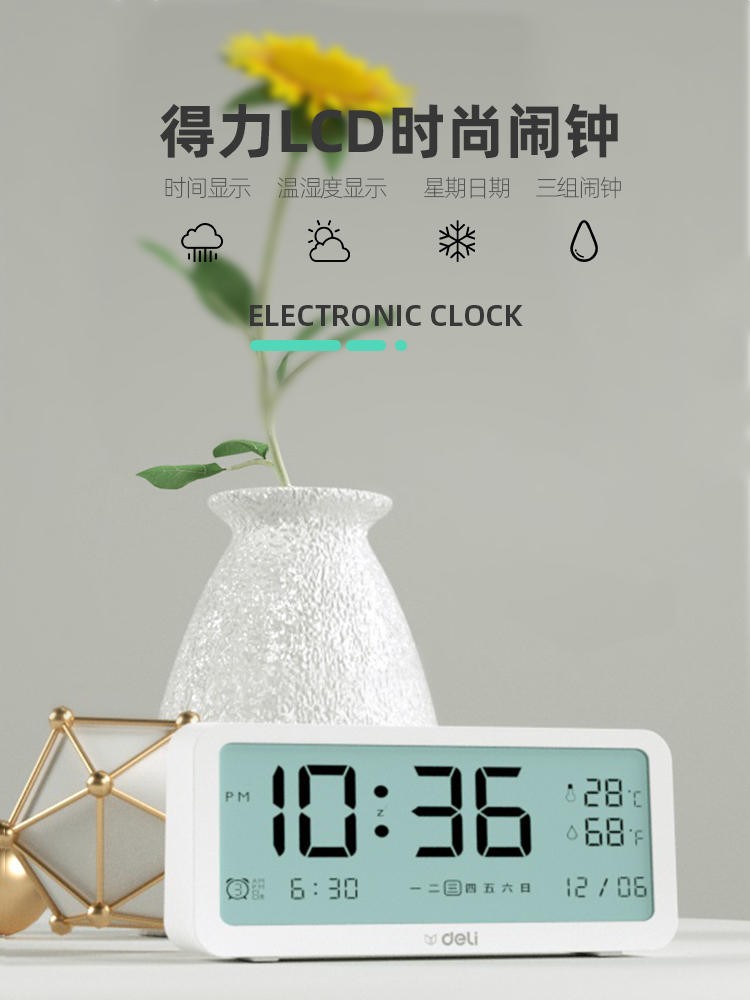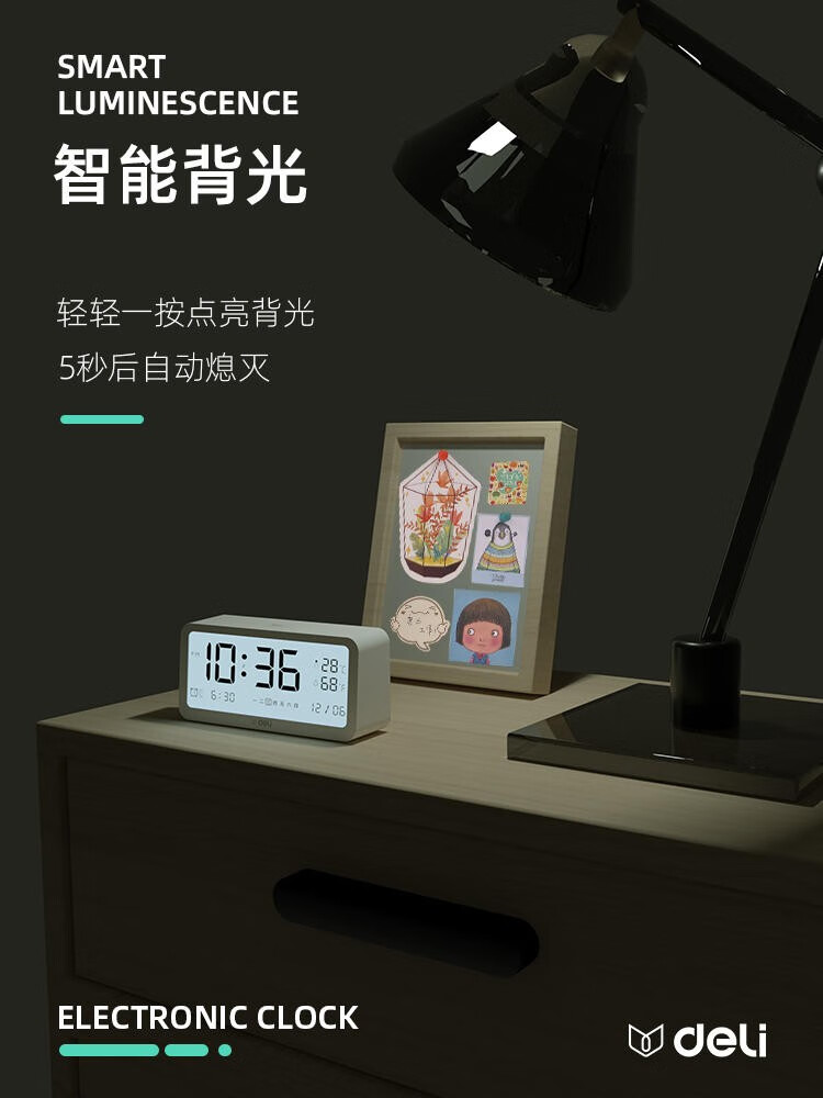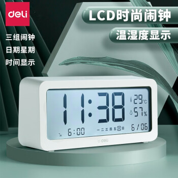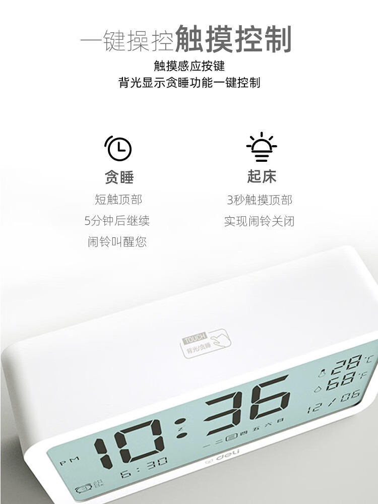 得力/deli 8827 座鐘 多功能電子鬧鐘學(xué)生用臥室床頭簡約智能溫濕度計桌面夜光靜音數(shù)字智能時鐘表 大號白色【192*88*50mm】