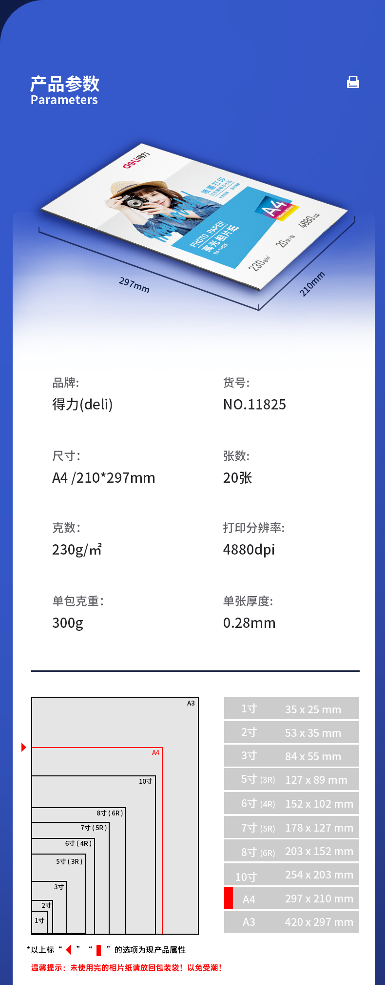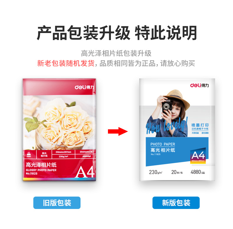 得力(deli)11825 噴墨/相片紙/卡紙 A4 230g高光面照片紙 相片打印紙 20張/包