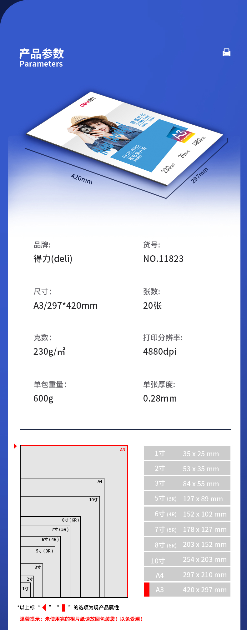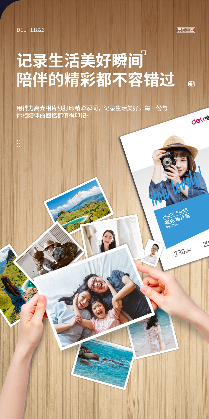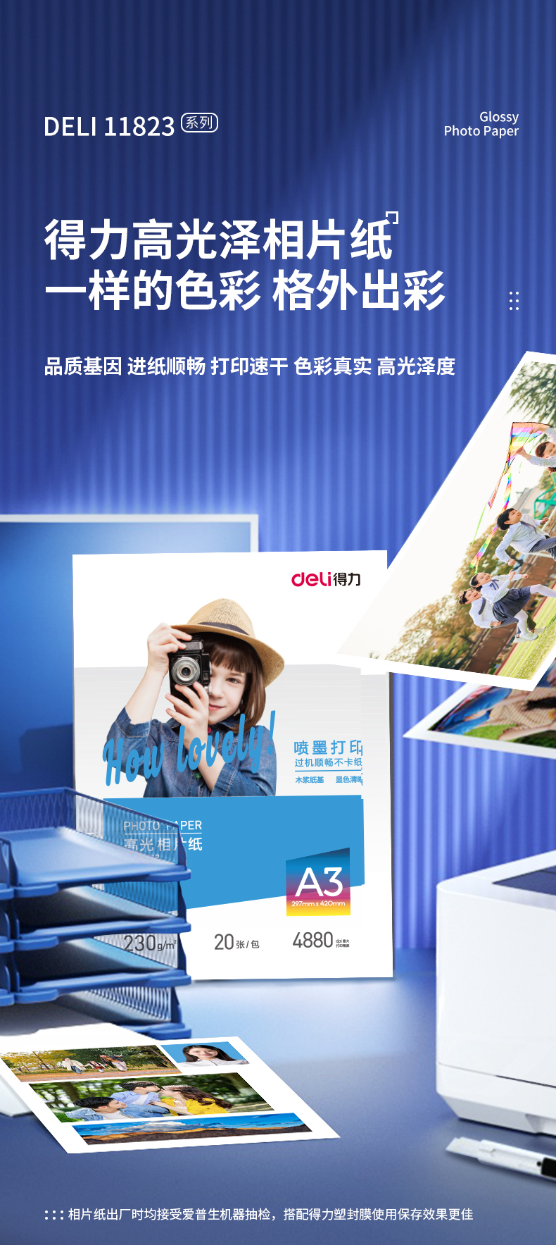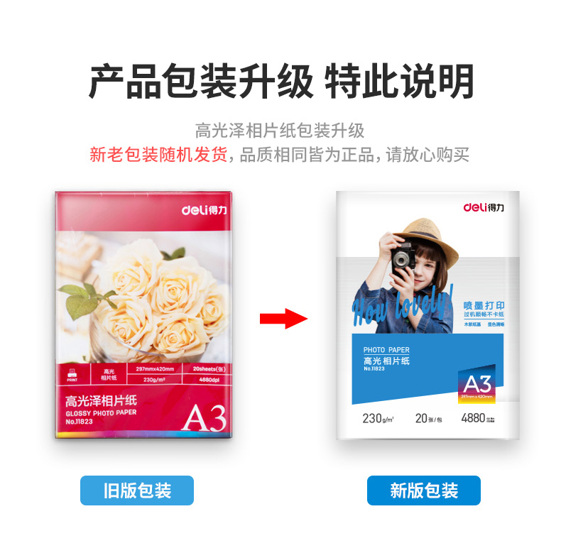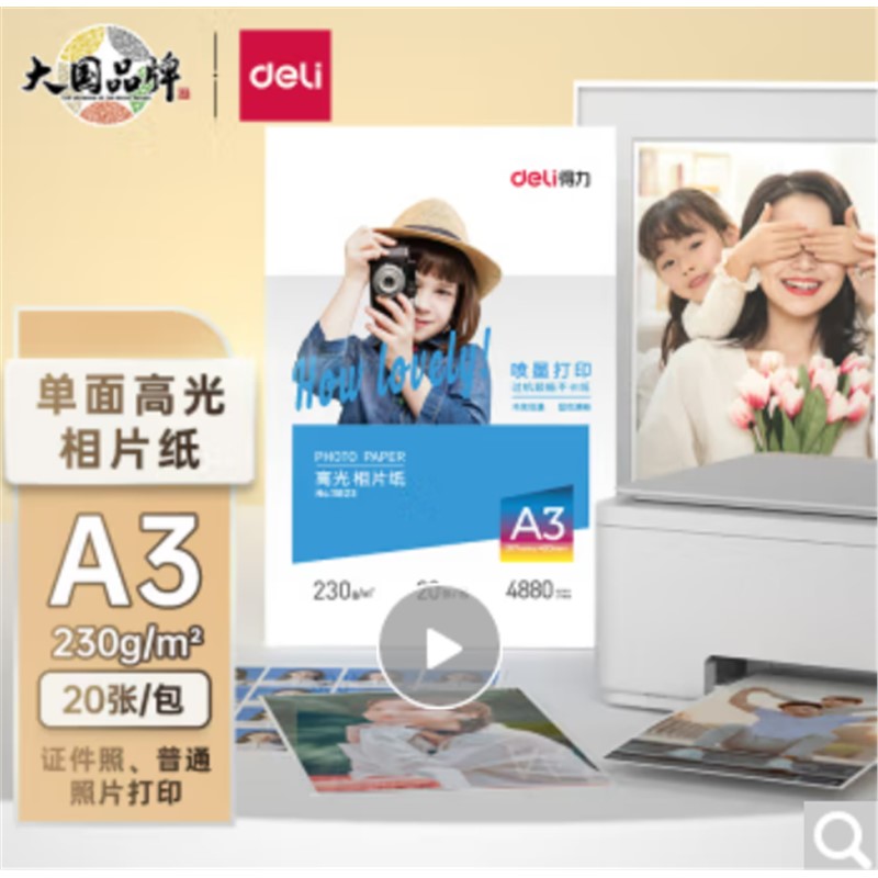 得力(deli)11823 噴墨/相片紙/卡紙 A3 230g高光面照片紙 相片打印紙 20張/包