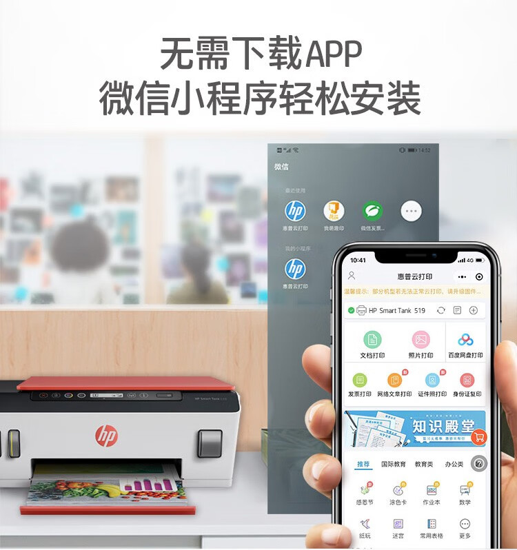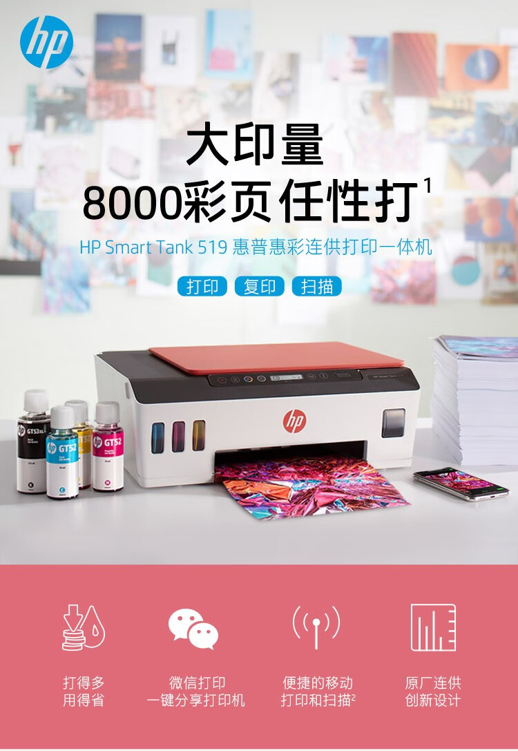 惠普(HP) 打印機(jī)A4彩色噴墨 連供 復(fù)印機(jī)掃描機(jī)一體機(jī) 無線手機(jī)打印 家用 519 同518 Tank 519(墨倉內(nèi)置無線連接 )