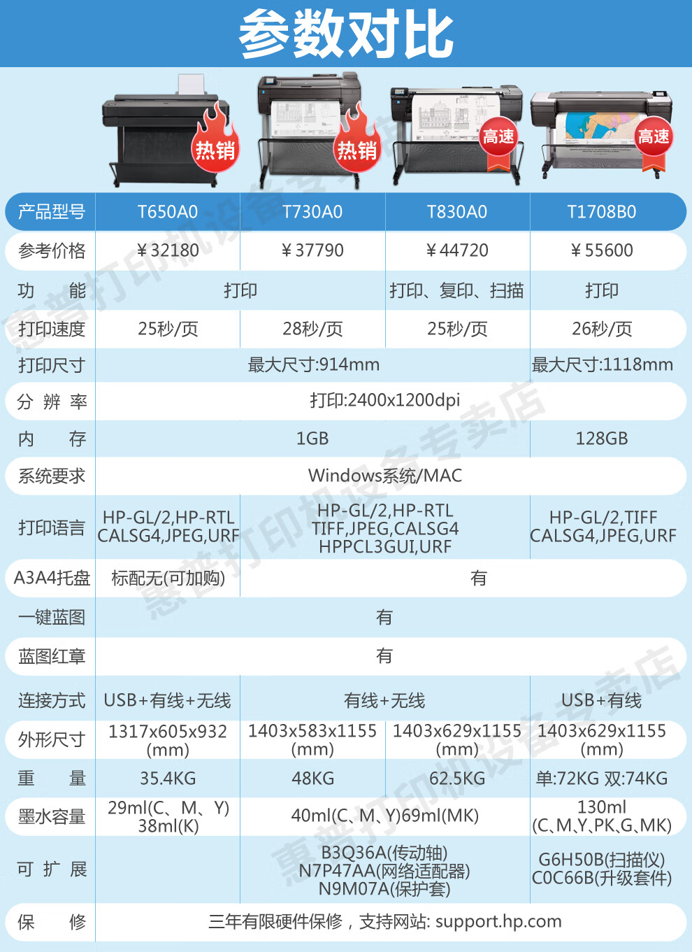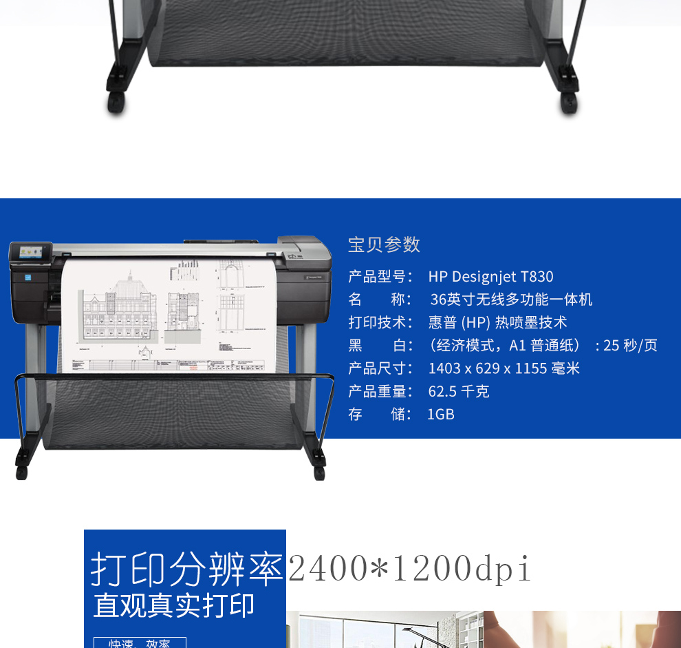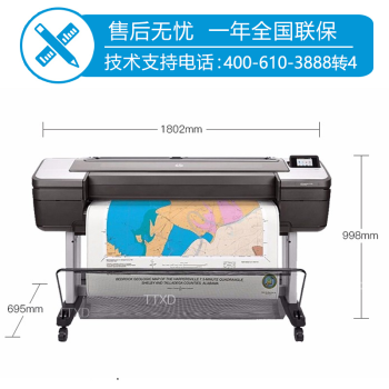 惠普(HP) 繪圖儀 A1A0t650\/730\/830大幅面寫真噴繪機打印機工程CAD及線條藍圖 T1708dr B0+44英寸6色雙紙軸三年服務
