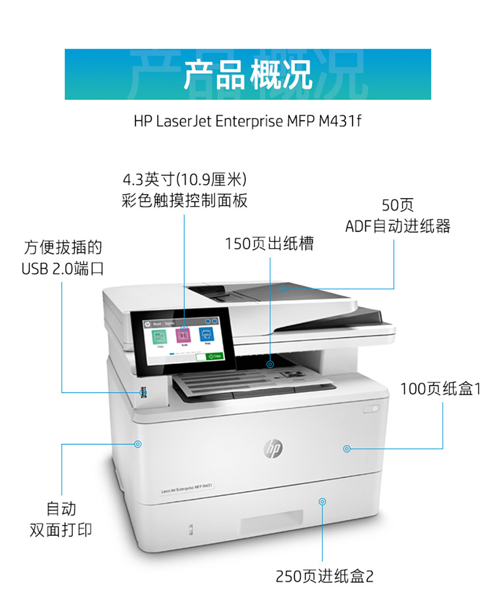 惠普/HP M431f A4 黑白打印機(jī) 多功能一體機(jī) 自動雙面 打印 復(fù)印 掃描 傳真有線連接