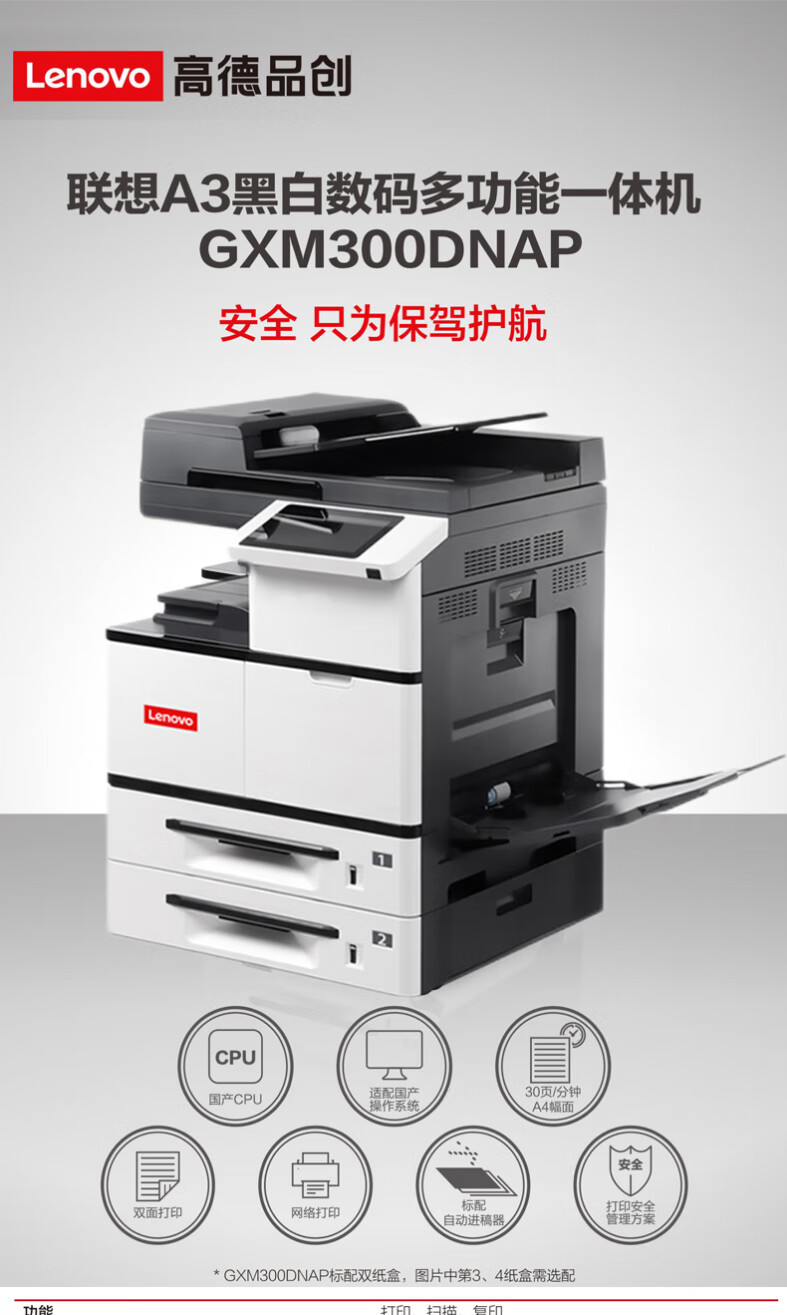 聯(lián)想(Lenovo)GXM300DNAP A3黑白多功能打印機(jī)(復(fù)印/掃描/30ppm/雙面打印/網(wǎng)絡(luò)打印/自動(dòng)輸稿器/國產(chǎn)化)