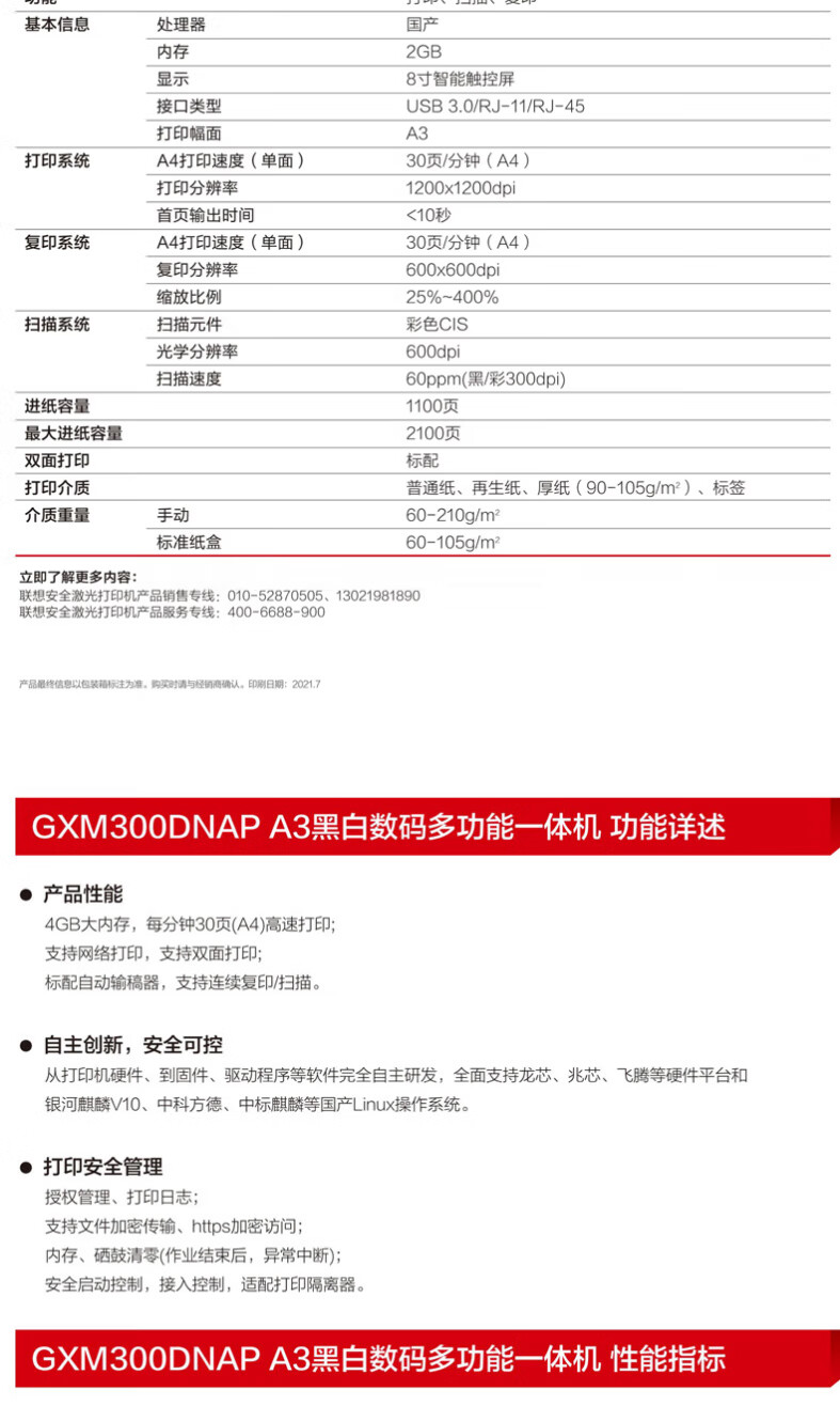 聯(lián)想/LENOVO GXM300DNAP A3 黑白打印機(jī) 多功能打印機(jī)(復(fù)印/掃描/30ppm/雙面打印/網(wǎng)絡(luò)打印/自動(dòng)輸稿器/國產(chǎn)化)