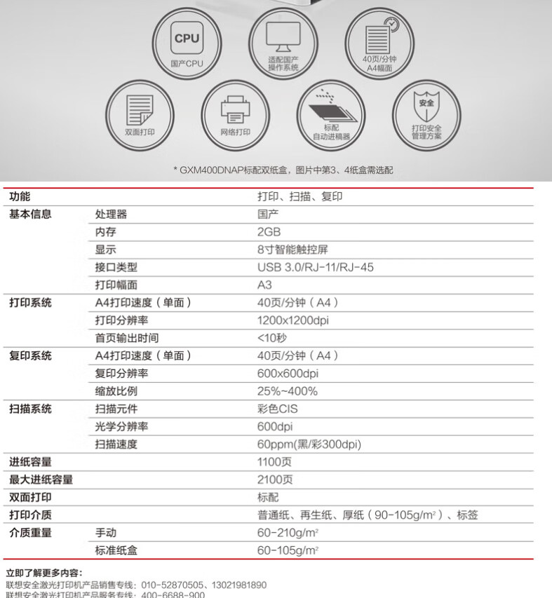 聯(lián)想(Lenovo)GXM400DNAP A3黑白多功能(打印/復(fù)印/掃描)40ppm/雙面打印/網(wǎng)絡(luò)打印/自動(dòng)輸稿器(國產(chǎn)化)