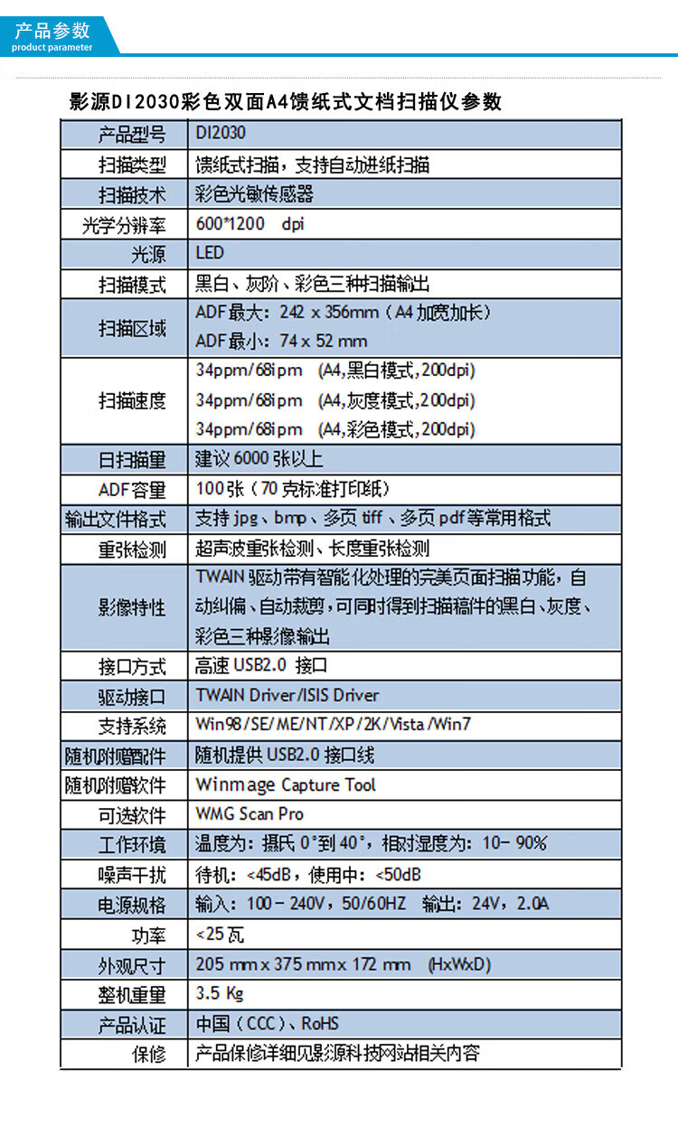 影源/WinMage DI2030 掃描儀 彩色雙面高速打印文檔掃描儀 自動(dòng)雙面掃描 600dpi分辨率 全國(guó)產(chǎn)化掃描儀