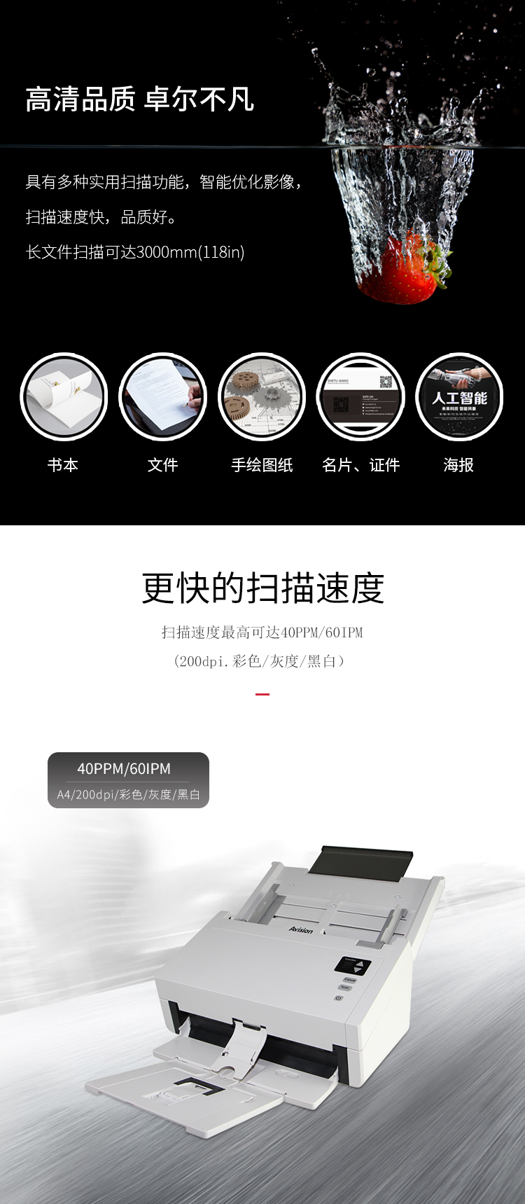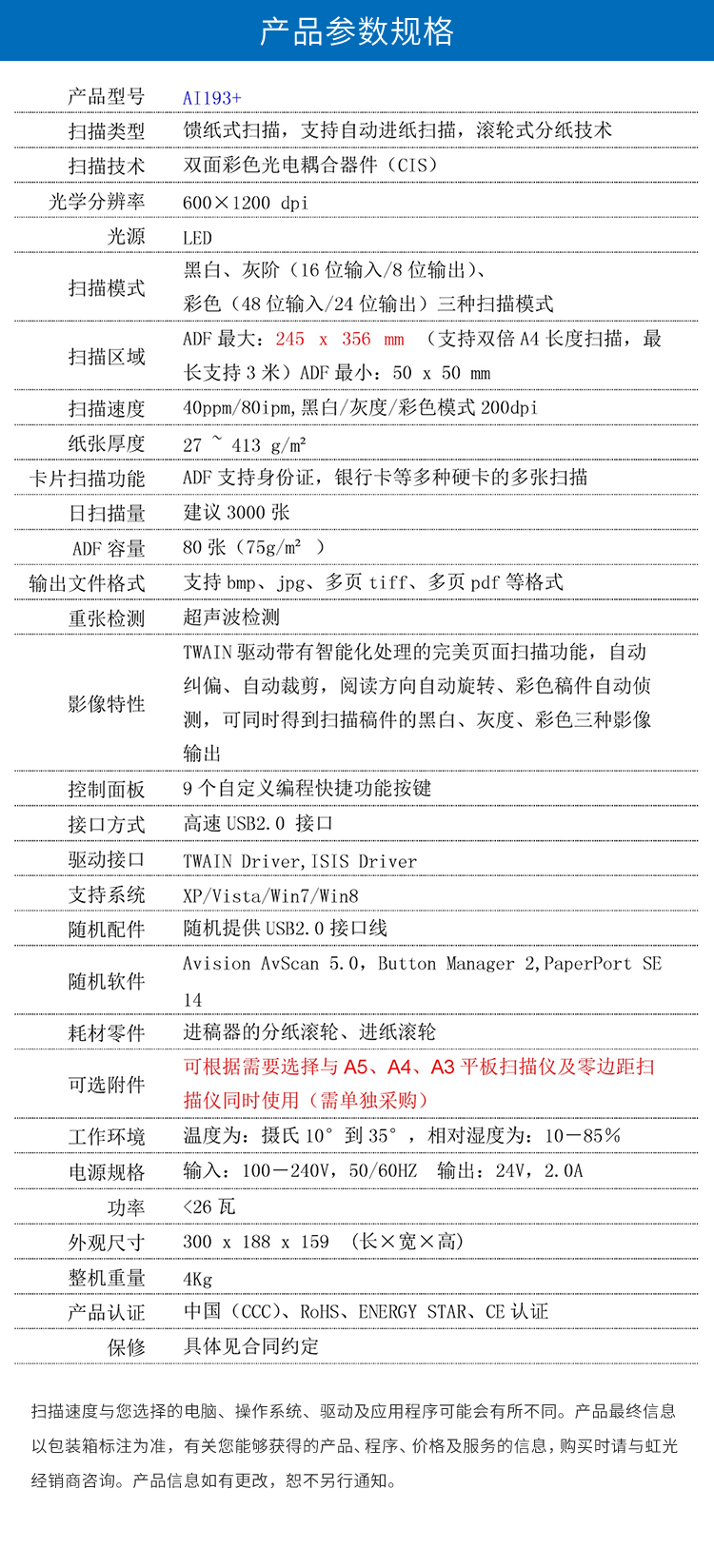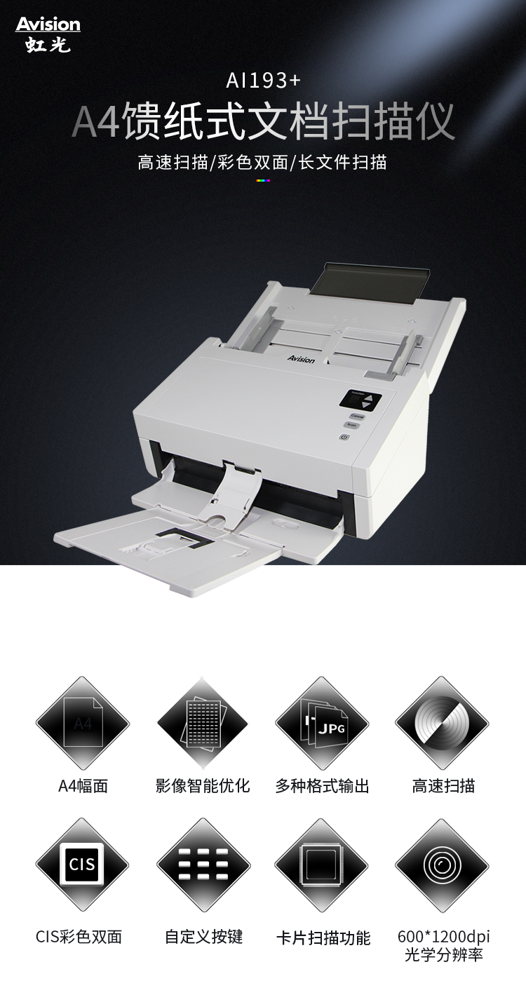 虹光(Avision)AI193+ A4饋紙式彩色雙面高速文檔掃描儀 商務掃描/自動雙面掃描