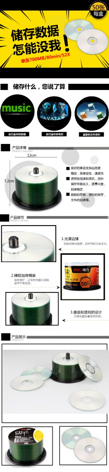 得力3725塑盒裝50片52X可記錄式 CD光盤CD刻錄盤刻錄光盤