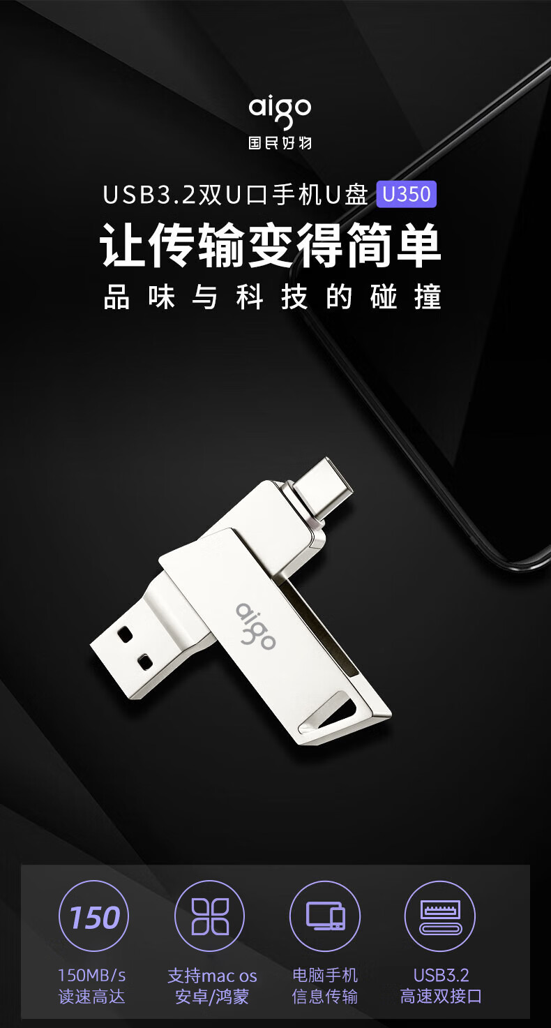 愛國者(aigo)U350 U盤/存儲卡 64GB Type-C手機U盤 U350 高速兩用 雙接口U盤 USB3.2 OTG 安卓蘋果筆記本電腦通用優(yōu)盤